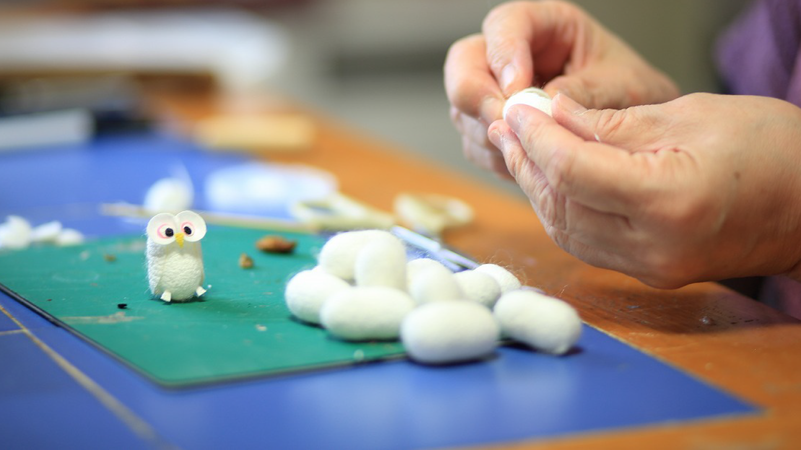 工房では、お子様から大人の方まで、どなたでもお気軽にまゆ細工を体験いただけます。